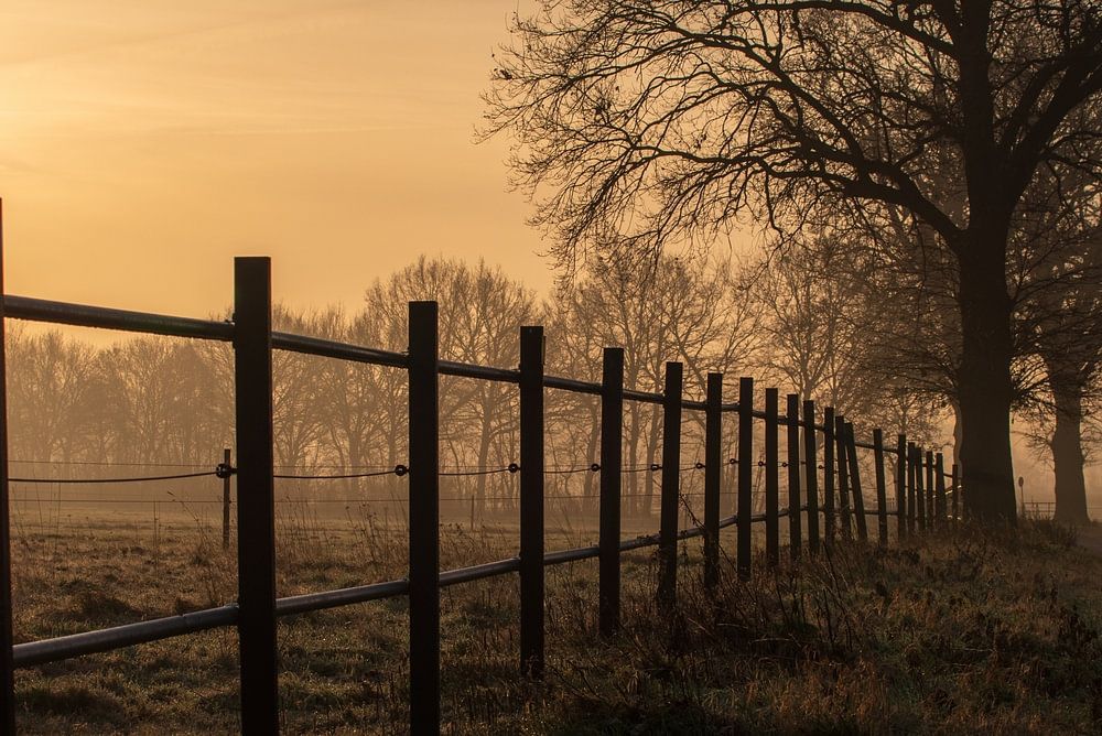 Een kalme winterochtend in het eerste zonlicht. De lage stand van de zon baadt het landschap in warme gouden tinten, terwijl het hek en de boom een duidelijke lijn trekken in de diepte van het beeld. Lichte vorst en fijne mist geven het tafereel een rustige, bijna tijdloze sfeer.