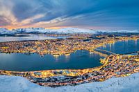 Panorama van Tromso, Noorwegen bij zonsondergang in de winter