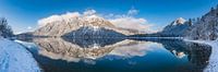 Prachtige weerspiegeling van het winterse bergpanorama in de Heiterwanger See bij Reutte, Tirol, Oostenrijk. Vroeg in de ochtend was de verse sneeuw onaangeroerd en het water spiegelglad.