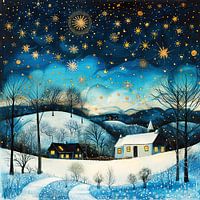 Dit kunstwerk weerspiegelt een serene en dromerige winteravond met een modern-folkloristische uitstraling. De glooiende heuvels, omgeven door bomen in wintersilhouetten, worden verlicht door een sterrenhemel vol gouden en stralende accenten. De warme gloed uit de ramen van de huizen contrasteert prachtig met de koude, heldere tinten van het winterlandschap.