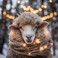 Een bijzonder dierenportret van een schaap, gewikkeld in een warme sjaal en omwikkeld met lampjes.