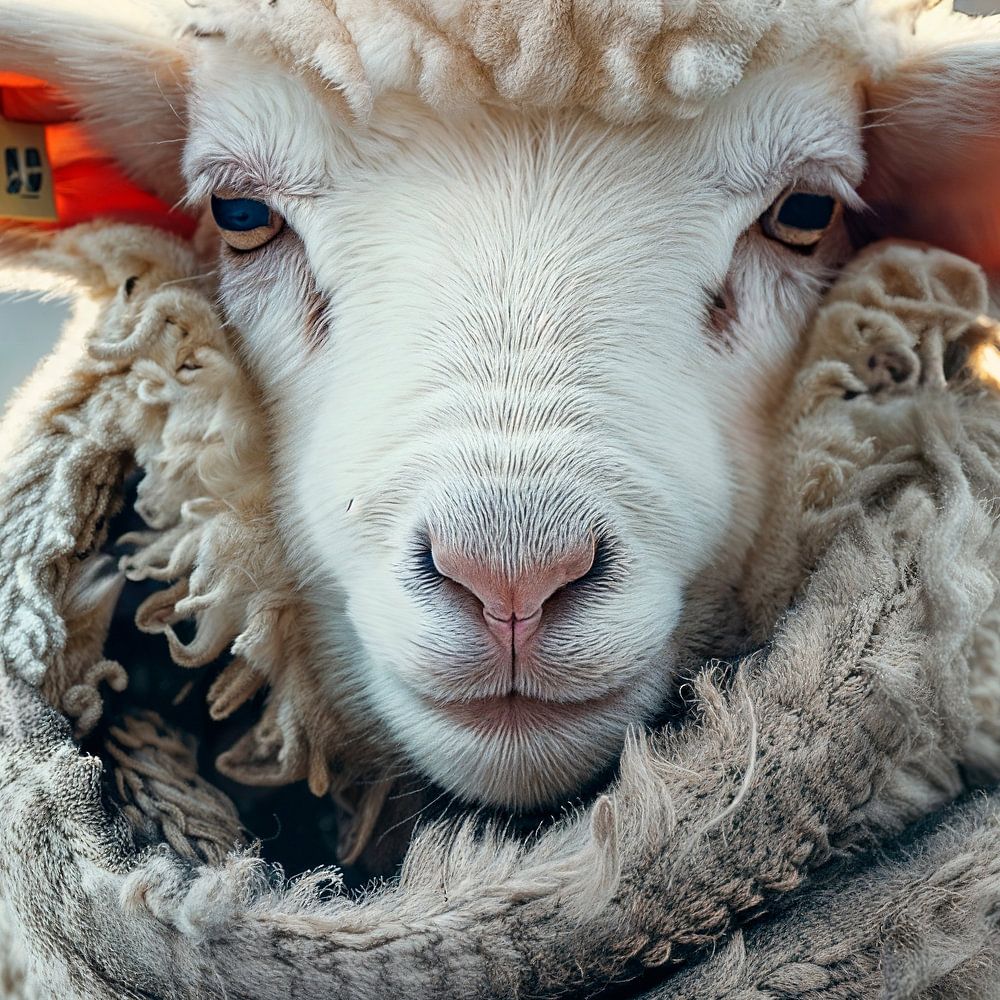 Een portret van een schaap, recht in de camera kijkend, omwikkeld in een doek. Het schaap staat centraal in het beeld, met een achtergrond die is gevuld met lichtpuntjes, wat een rustige sfeer geeft.