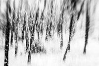Een winterfoto uit België van een winters landschap waarbij de bomen in het landschap wit worden van de sneeuw. De bomen in de foto zijn in onscherp en bewogen, ook bekend als ICM (Intentional Camera Movement). Deze techniek geeft het beeld een minimalistische en dynamische sfeer.