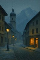 Een tijdloze winteravond ontvouwt zich in het hart van Garmisch-Partenkirchen, waar zacht vallende sneeuw de smalle straten in een vredige stilte hult. Gaslampen werpen hun amberkleurige gloed op de kasseien en leiden het oog naar het silhouet van een barokke kerktoren die plechtig oprijst tegen de in mist gehulde Alpen. Een zwak gouden licht valt uit een café op de hoek en nodigt uit tot warmte in de blauwe stilte van de nacht.