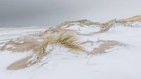 Strand en sneeuw. Een ´contradictio in terminis´ zou je bijna zeggen. De structuren komen zo nog mooier tot zijn recht. Bovenop staat fier rechtop wat kort helmgras ´groener dan groenste zijn in het verder kleurarme landschap. De foto is genomen op het strand van Petten, Noord Holland.