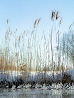Een winters beeld van de waterkant aan de Haarrijnse plas. Door de vrieswind vormen zich ijsklompen aan de rietstengels.