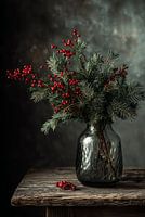 Een winterse compositie waarin felrode bessen en donkergroene dennentakken samenkomen in een grijze glazen vaas. Het stilleven staat op een verweerd houten oppervlak tegen een donkere achtergrond, wat zorgt voor een dramatisch contrast.