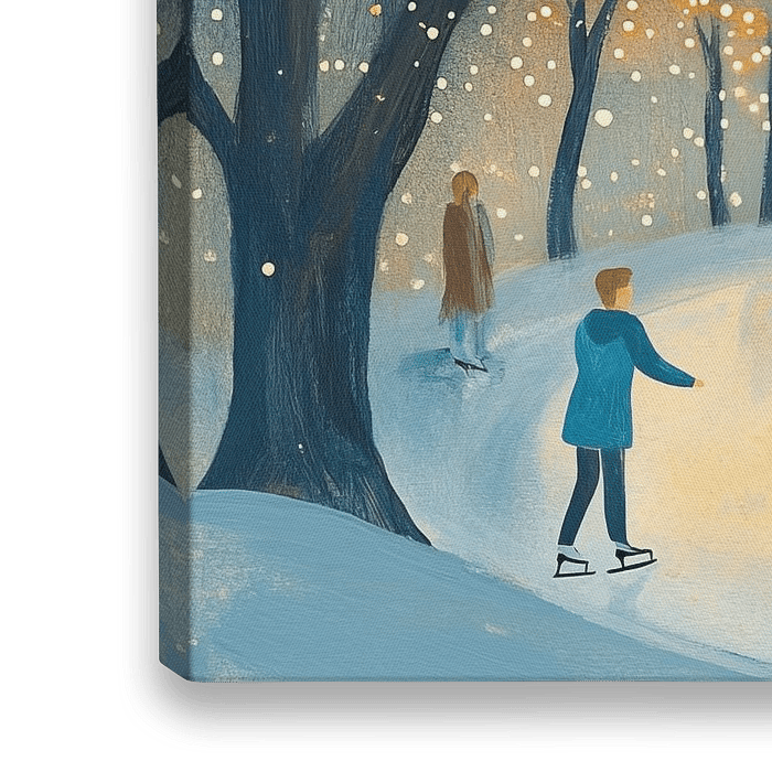 Winterse Schaatspret - Dit winter schilderij toont een groep mensen vredig schaatsend op een bevroren vijver onder betoverende lichtsnoeren die tussen sneeuwbedekte bomen hangen, waardoor een magische, serene kerstsfeer ontstaat.