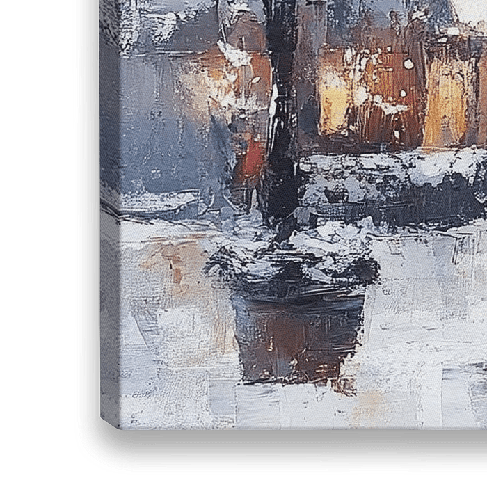 Winterse Stadsgezichten - Dit winterlandschapschilderij toont een levendige stedelijke Kerstmarkt met mensen die zich langs kraampjes en met sneeuw bedekte straten bewegen, waarbij de warme verlichting contrast biedt met het koele blauw en wit van de winterlucht.