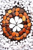 Deze verbluffende afbeelding toont een prachtige creatie in de sneeuw: een bloem gemaakt van witte kiezelsteentjes, omringt door een cirkel van bruine kiezels. De witte kiezels zijn zorgvuldig gerangschikt in de vorm van delicate bloemblaadjes, terwijl de bruine kiezels een perfecte omlijning vormen die de bloem accentueert. Het…