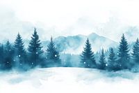 Dit sfeervolle aquarelkunstwerk toont een rustig winters boslandschap, met silhouetten van naaldbomen die opgaan in zachte, mistige tinten blauw. De bergen op de achtergrond en de verstilde sneeuwvlokken die langzaam naar beneden vallen, versterken de serene en meditatieve sfeer van deze illustratie. De ingetogen kleuren en het minimalistische ontwerp maken dit werk tot een perfecte aanvulling in een rustgevend interieur, ideaal voor liefhebbers van natuur, stilte en winterse landschappen.