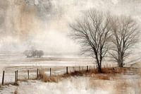 Een verstild sneeuwlandschap met twee karaktervolle bomen en een verweerd houten hek. De aardse kleuren – bruin, wit en zacht grijs – brengen warmte in de winterse leegte. Dit Fine Art werk past perfect in een Landelijke, Nieuw Landelijke of Romantische woonstijl en straalt een ingetogen kracht uit.
