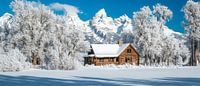 Een charmante houten hut schittert midden in een dromerig winterlandschap, omringd door glinsterende sneeuw en majestueuze bergen die in de verte oprijzen. De helderblauwe lucht geeft het landschap een vredige uitstraling. Dit beeld brengt een warme, uitnodigende sfeer in elke woonkamer en nodigt je uit om te dromen van gezellige avonden bij het vuur.