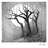Winterse bomen in het maanlicht - zwarte stift op papier getekend in 1972 als pointilistisch experiment - Pieter Ringoot (1921 - 2011)