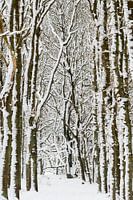 Verticale foto van een besneeuwd wandelpad omring door bomen. De bomen en takken vormen een mooi contrast tussen diner en licht door de sneeuw die erop ligt.