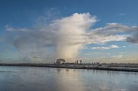 Een winterse bui tijdens een koude dag in januari. De bui spiegelt zich in het ijs. Het ijslaagje in de rivier geeft hoop op winterpret.
