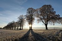 Lindenlaan in de winter met een zonnester tussen de bomen