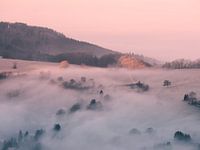 Winterse ochtendmist op het zand van Heubach tijdens zonsopgang (Ostalb, Baden Württemberg)