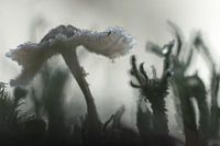 Deze paddenstoel had een prachtig laagje rijp over zich heen gekregen na een koude nacht. Het springstaartje voegt wat extra toe aan de foto. Daarnaast heeft de foto fijne koude tinten.