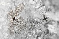 "Winterse reflectie: een hortensiablaadje met spiegelbeeld" is een macrofoto van een hortensiablaadje in een ijzig aanvoelende omgeving, met voornamelijk wit en grijstinten. Het hortensia blaadje lijkt zichzelf te bekijken in het spiegelende ijzige oppervlak.