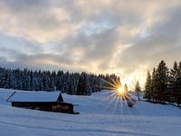 Een betoverende zonsondergang in een idyllisch winterlandschap bij Krün in Opper-Beieren. Een rustieke houten schuur met een besneeuwd dak, een prachtige bewolkte sfeer en de zon die langzaam achter de bomen verdwijnt.