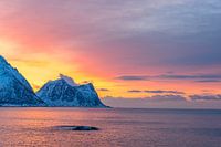 Winterse zonsondergang boven de Noorse Zee in Noord-Noorwegen op het eiland Senja aan het einde van een mooie winterdag.