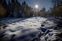 Een koud zonnetje duikt langzaam achter de besneeuwde horizon. Deze foto is geschoten op een dag in Januari in het mooie Hürtgenwald in Duitsland.
