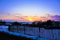 Mooie zonsondergang op een koude winterdag in de Ardennen in Belgie. Mooie roze en paarse lucht.