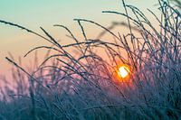 Foto van sprieten bij zonsopkomst in de winter