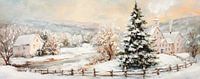 Wintersfeer - Dit winterlandschap schilderij toont een sereen sneeuwbedekt dorp met een prominent versierde kerstboom in het midden, omringd door pittoreske witte huizen en een bevroren rivier die het tafereel doorkruist.