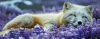 Dit kunstwerk toont een adembenemend beeld van een poolvos die diep in slaap is te midden van een veld van paarse bloemen, bedekt met een dun laagje sneeuw.