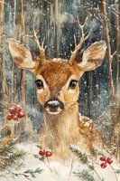 Dit serene portret toont een schattig hertenkalf in een besneeuwd bos, omringd door takken en helderrode bessen. Met grote, nieuwsgierige ogen kijkt het kalfje de wereld in, terwijl sneeuwvlokken zachtjes op zijn vacht vallen. De achtergrond van kale bomen en zachte sneeuwvlokken benadrukt de rustige, winterse sfeer van dit kunstwerk, dat perfect de vredige schoonheid van de natuur in de winter vastlegt. Ideaal voor liefhebbers van wildlife en natuurlijke winterdecoratie, en een warme toevoeging aan elk huis tijdens de feestdagen.