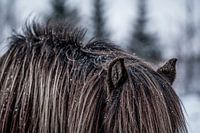 Deze sfeervolle close-up legt de prachtige texturen van de manen en oren van een paard vast, subtiel bestrooid met fijne sneeuwvlokken. De donkere, warme kleuren van de vacht worden prachtig geaccentueerd door de zachte, ijzige achtergrond met wazige silhouetten van bomen. Het beeld straalt een gevoel van rust en harmonie uit, waarbij…