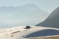 Een betoverend winters landschap met een eenzaam houten hutje op een besneeuwde heuvel nabij het Oostenrijkse Lermoos. De zachte ochtendzon werpt een warme gloed over het witte landschap, terwijl de imposante, mistige bergtoppen op de achtergrond een serene diepte creëren. De eenvoud van de compositie, gecombineerd met het spel van licht en schaduw, straalt rust en eenzaamheid uit – een ode aan de stilte van de natuur.