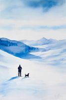 Dit indrukwekkende aquarel schilderij toont een uitgestrekt, besneeuwd landschap gedomineerd door zachte blauwe tinten. Een eenzame wandelaar staat met zijn hond aan de rand van het sneeuwveld en drukt de harmonie uit tussen mens en dier in de stilte van het winterlandschap. De majestueuze bergen op de achtergrond versterken het gevoel…