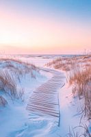 Een zachte houten loopbrug baant zich een weg door een winters duinlandschap, omgeven door zacht, sneeuwwit zand. De zachte pastelkleuren van de lucht vermengen zich harmonieus met de koele, kalme sfeer van de zee. Dit creëert een gevoel van rust en verlangen, een uitnodiging voor een dromerige wandeling aan de rand van de wereld.