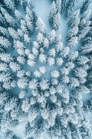 Een majestueuze zee van besneeuwde dennenbomen spreidt zich uit als een levend mozaïek. De koele, zilverachtige tinten versmelten harmonieus, terwijl de zachte sneeuw de contouren van de bomen zachtjes omhult. Het is de stilte van de winter die hier wordt belichaamd in elke kantige tak, alsof de natuur diep ademhaalt.