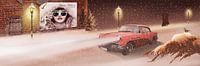 Romantische Scène van de winter met vintage auto op besneeuwde weg met mode poster op een oude muur huis in panorama-formaat.
