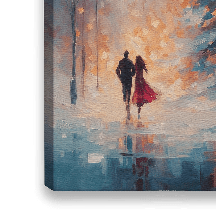 Een sfeervolle winterscène in impressionistische stijl waar twee silhouetten wandelen langs een verlichte lantaarnpaal. De grote kerstboom baadt in een warme gloed van oranje en turquoise tinten, terwijl de reflecties op het natte plaveisel een magische sfeer creëren. Het contrast tussen de warme lichtpunten en de koele winterse…