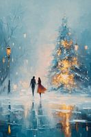 Een betoverend winterlandschap waarin twee silhouetten wandelen langs een verlichte kerstboom in een mistig park. De zachte, impressionistische penseelstreken in ijsblauwe en warme gouden tinten creëren een dromerige sfeer, terwijl lantaarnpalen een magisch lichtspel vormen op het spiegelende oppervlak.