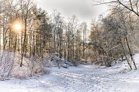 Besneeuwd bos in Doorn (Doornse Gat) met door de bomen heen een waterig zonnetje.