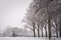 Deze sfeervolle winterfoto toont een serene parkscène onder een zachte sneeuwdeken. Imposante loofbomen domineren het beeld, hun kale takken zwaar beladen met verse sneeuw die een delicaat wit kantwerk vormt tegen de lichtgrijze winterhemel. De bomen staan in een rij langs wat lijkt op een voetpad of parkweg, hun donkere stammen…