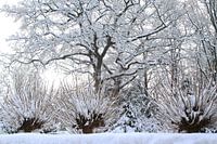 Een schilderachtig wintertafereel, structuren van grillige takken van besneeuwde bomen boven een sneeuwdek, winter in Nederland. Kou, sneeuwval, wintersfeer. Sneeuwpracht, een lading vers gevallen sneeuw roept vaak een kinderlijk enthousiasme op voor sleetje rijden, sneeuwpoppen maken, sneeuwballen gooien en magische wandelingen in de…