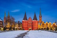 Winteraanzicht van Holstentor in Lubeck, Duitsland met kerstversiering