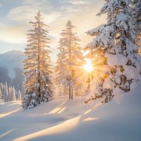 Zachte zonnestralen breken door de ijzige stilte van een besneeuwd landschap, terwijl majestueuze dennenbomen in volle winterpracht staan. De glinsterende sneeuw reflecteert het zachte licht en verleent het tafereel een bijna magische sfeer. Hier lijkt de tijd stil te staan terwijl de natuur haar winterse schoonheid onthult.