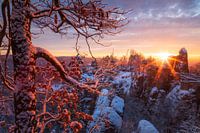 Een prachtige winterdag begint met een grote zonsopgang op de Bastei in Saksisch Zwitserland. Door een klein gat in het wolkendek stuurt de zon kortstondig een paar opwarmende stralen.