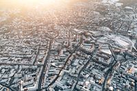 Stadsgezicht van Wernigerode in de winter als de zon ondergaat. Luchtfoto van de kleurrijke stad in het Harzgebergte