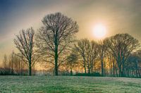 Zon boven de bomen bij landgoed Broekhuizen in Leersum. Het gras is wit van de rijp.