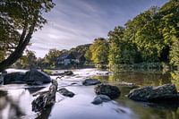 De historische maalderij Wipperkotten aan de Wupper in het avondlicht, oriëntatiepunt van het Bergisches Land, Solingen, Duitsland