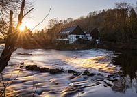 Lang belichte panoramafoto van de Wipperkotten aan de Wupper bij Solingen bij zonsondergang, Bergisches Land, Duitsland
